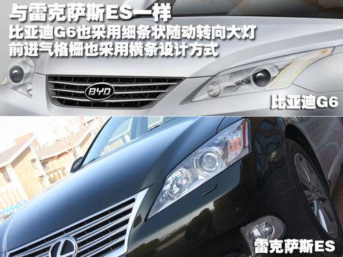 比亞迪G6的前臉是與雷克薩斯ES最為相似的地方,從圖片中可以看到,比亞迪G6的前臉進氣格柵采用橫條貫穿,設(shè)計方式與雷克薩斯ES一模一樣。所不同的是,雷克薩斯ES的進氣格柵采用質(zhì)感十足的四個鍍鉻條,而比亞迪G6只采用3個裝飾條,顯得有幾分單薄。