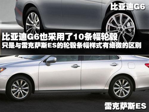 比亞迪G6采用的是10條幅鋁合金輪轂,目前還不確定輪胎的尺寸。但我們可以從輪轂樣式上看出來,比亞迪G6模仿雷克薩斯ES的確非常仔細,這兩款車只有輪轂條幅的樣式有很細微的區(qū)別。多條幅的輪轂樣式看上去帶有幾分運動感,似乎與比亞迪G6整車的豪華定位略有不符。