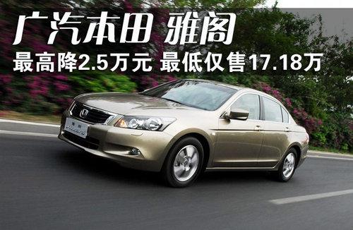 當提到中級車型大家也許會不約而同的想起廣本雅閣,新雅閣憑借其大氣的外觀、舒適的空間和豪華的配置對于中級轎車市場的構成起到了舉足輕重的作用。去年,廣汽本田又對第8代雅閣進行了小改款,對原來車型的配置有一定程度提升,部分車型增加了智能鑰匙和后遮陽板等配置,提高了雅閣整體車型的性價比。近日根據網上車市價格監(jiān)測系統(tǒng)顯示,目前雅閣現(xiàn)金最高優(yōu)惠2.5萬元,最低售價逼平17萬。具體價格以及優(yōu)惠幅度如下: