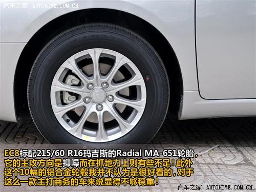 作為一款中型豪華車型,帝豪EC8必須使用鋁合金輪轂,不過圖中的這個(gè)10條幅樣式我個(gè)人不認(rèn)為很好看,或者說是顯得不夠穩(wěn)重。此外,為了配合中型車應(yīng)該有的靜謐性,在輪胎上使用了瑪吉斯產(chǎn)的MA-651型靜音輪胎,同樣由于這個(gè)輪胎是偏向于抑制輪噪,因此在抓地力上有些不足,不過對(duì)于一款注重乘坐感的車來說,太強(qiáng)的抓地力不是重要的。