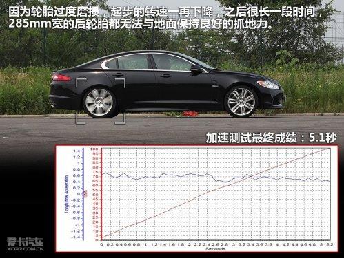 當(dāng)進(jìn)行加速測(cè)試時(shí),按慣例我們會(huì)阻止所有電子系統(tǒng)介入,將轉(zhuǎn)速維持在發(fā)動(dòng)機(jī)最佳發(fā)力區(qū),在起步的瞬間使輪胎處于滑與不滑的臨界點(diǎn),之后全力沖刺。不過(guò)很抱歉,經(jīng)過(guò)多次嘗試,我們無(wú)法令XFR獲得最佳的起跑狀態(tài),原因就是因?yàn)檩喬ミ^(guò)度磨損,起步的轉(zhuǎn)速一再下降,而順利起步之后很長(zhǎng)一段時(shí)間,285mm寬的后輪胎都無(wú)法與地面保持良好的抓地力。通過(guò)加速曲線圖也可以看出,起步后接近1秒的時(shí)間,加速度都不高,有時(shí)還處于下降狀態(tài),最終5.1秒的加速成績(jī)并不是XFR的最強(qiáng)能力。