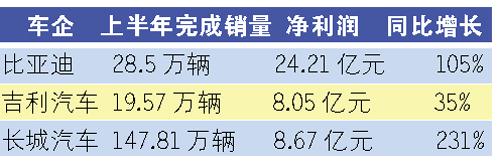 受益于上半年車市的產(chǎn)銷兩旺,三大車企的業(yè)績?nèi)飄紅,其中長城汽車取代比亞迪成為業(yè)績增長最迅速的民營車企,吉利汽車忙于整合沃爾沃轎車業(yè)務,暫時沒有突出表現(xiàn)。