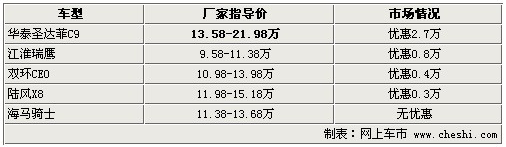 在五款自主品牌SUV中除了上市時間不長的海馬騎士外,其他4款車型均有不同程度的優(yōu)惠。其中華泰圣達菲2.7L版本車型出現(xiàn)了2.7萬的最高優(yōu)惠,其他三款車的優(yōu)惠程度一般。