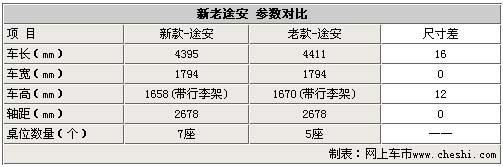 上海大眾即將批量生產的小改款途安在車身尺寸上與國外已經上市銷售的車型基本一致,與現款車型相比幾乎沒有變化。小改款途安仍舊來自大眾的PQ35平臺,與老款車型相比在長度方面增加了1.6厘米,寬度、軸距不變,高度僅增加了12毫米。以前2.0L車型沒有第三排座椅,為標準5座。小改款的途安將第三排座椅標配,成為了標準的7座MPV車型。