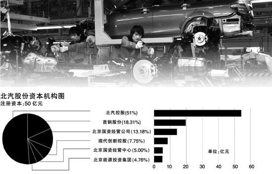 根據(jù)首鋼股份的公告,北汽股份注冊資本為50億元,發(fā)起人的出資總額為106.43億元,其中,經(jīng)評估的股權(quán)與實(shí)物資產(chǎn)合計(jì)為81.43億元,現(xiàn)金25億元。北汽控股將以出資總額54.27億元持有25.5億股,持股比例為51%。首鋼股份總出資額19.49億元,持股9.16億股,持股比例為18.31%,為第二大股東。