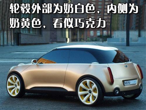 MINI Core概念車采用內(nèi)凹陷七幅白色輪轂,內(nèi)側(cè)噴涂的是奶黃色,造型非?蓯劬腿缬汕煽肆χ瞥梢粯印