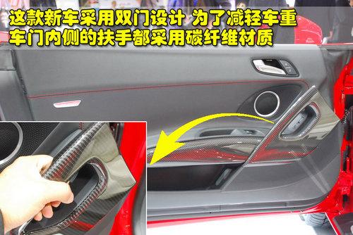 奧迪R8 4.2L敞篷版采用雙門開啟方式,為了減輕車重,車門內(nèi)側(cè)的扶手都采用碳纖維材質(zhì)打造。而且車門的內(nèi)襯大部分都采用真皮材質(zhì)包裹,質(zhì)地非常柔軟。車門內(nèi)側(cè)還設(shè)計(jì)了儲物空間,方便存放比較小的隨身物品。