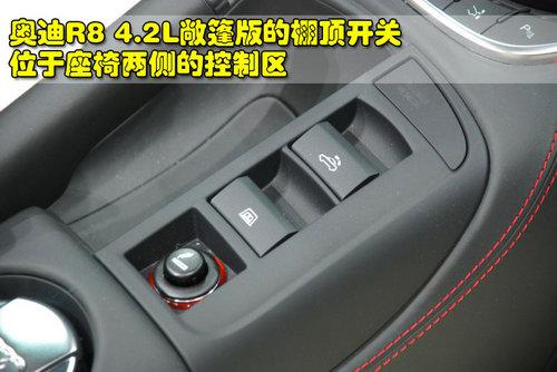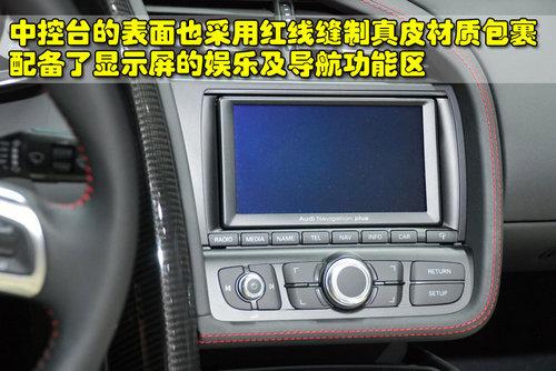 奧迪R8 4.2L敞篷版的中控臺(tái)周圍都采用真皮包裹,并且紅線縫制顯得運(yùn)動(dòng)感更強(qiáng)。中控臺(tái)兩側(cè)都采用了輕量化碳纖維裝飾板。中控臺(tái)頂部配備了大尺寸顯示屏,娛樂(lè)功能和導(dǎo)航功能都一應(yīng)俱全。奧迪R8 4.2L敞篷版的頂棚開(kāi)關(guān)位于中央扶手前的位置,獨(dú)立的設(shè)計(jì)方便方便駕駛員或操作。