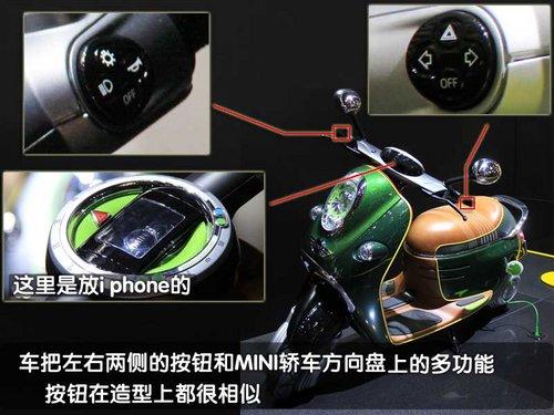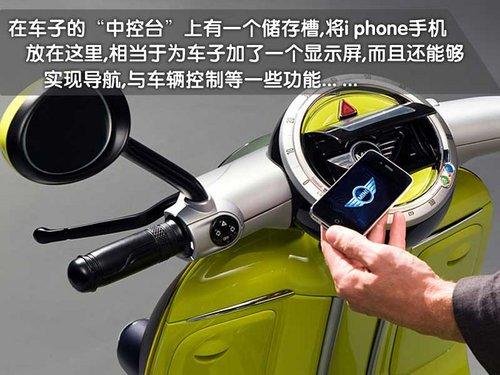 MINI Scooter E概念車將i phone手機(jī)與電動(dòng)車融合,通過位于車輛頂端的專用接口。車主的i phone手機(jī)可以放置于其中,與車輛的音響和信息與了系統(tǒng)實(shí)現(xiàn)最大化的兼容。此外,還有一項(xiàng)有趣的功能,可以通過谷歌地圖來顯示其它騎車者的位置,甚至可以發(fā)出結(jié)伴而行的邀請。