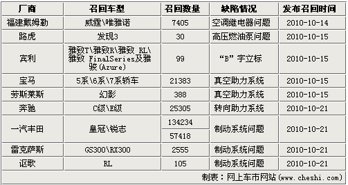 從上面的統(tǒng)計(jì)表可以看出,從10月14日開始召回公告頻頻發(fā)布,僅15日一天就有4個(gè)品牌實(shí)施召回,而它們還是市場(chǎng)中的豪華品牌甚至超豪華品牌如勞斯萊斯、賓利,奔馳、寶馬也沒(méi)有落后分別召回其主力車款寶馬5系、7系和C級(jí)、E級(jí)。曾備受關(guān)注的豐田品牌再次實(shí)施召回,這次是皇冠和銳志總召回接近20萬(wàn)輛。而在召回原因中,制動(dòng)系統(tǒng)問(wèn)題占了很大的比重,這點(diǎn)有點(diǎn)令消費(fèi)者擔(dān)心。