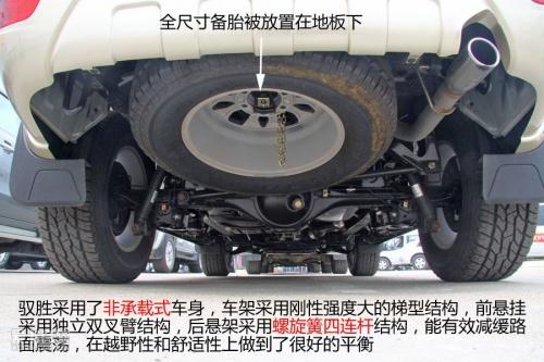 馭勝采用了非承載式車身,車架采用剛性強度大的梯型結(jié)構(gòu),前懸掛采用獨立雙叉臂結(jié)構(gòu),后懸架采用螺旋簧四連桿結(jié)構(gòu),能有效減緩路面震蕩,這樣的設(shè)計在越野性和舒適性上會有很好的平衡。