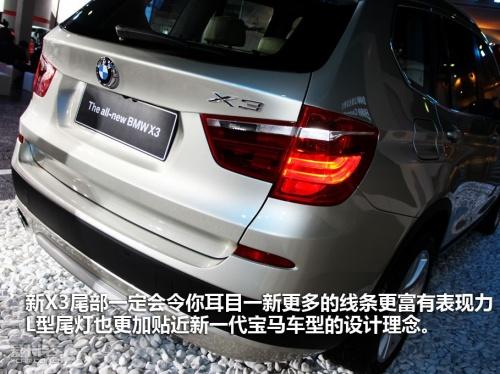 外觀方面全新寶馬X3外型延續(xù)了寶馬X系車型的特點(diǎn),雖然X車系中往下有X1、往上有X5及X6,但新X3并不是縮小版的X5,很多獨(dú)有的外型特征,顯示出X3與眾不同的性格。