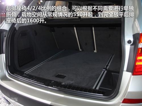 行李廂空間也是新X3的賣點之一,后排座椅4/2/4比例的組合,可以根據(jù)不同需要進(jìn)行單獨折疊,載物空間從常規(guī)情況的550升起,到完全放平后排座椅后的1600升,充分滿足寶馬X3車主的需要。