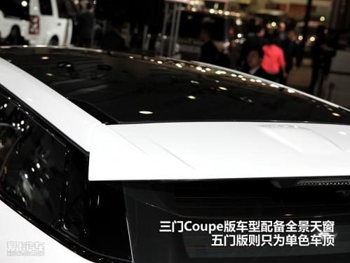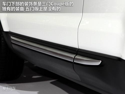 車身側(cè)面線條是其設(shè)計(jì)的一大看點(diǎn),凸起的腰線挺拔清晰,逐漸上揚(yáng)貫穿整個(gè)車身。前翼子板處的散熱口真正發(fā)揮作用的面積很小,更多的是為提升美觀服務(wù)。車門下部的裝飾條是三門Coupe版的獨(dú)有的裝備,五門版上是沒有的。
