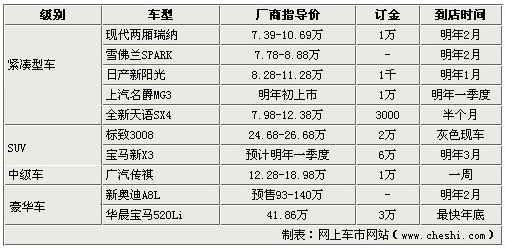 本屆廣州車展上市新車并不比北京車展多,但是所上車型基本都屬于重量級產(chǎn)品。據(jù)各廠家經(jīng)銷商銷售人員表示,十款新車大部分目前都已經(jīng)開始接受預定,并且提車時間也都集中在2011年初的第一季度,相信喜歡這些車型的朋友們?nèi)绻鍪值脑,現(xiàn)在就可以進行預定了。