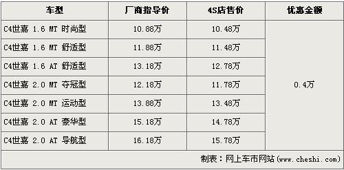 C4世嘉是東風(fēng)雪鐵龍于2008年7月28日發(fā)布的去年第二款新車,廠商指導(dǎo)價(jià)為10.88萬-16.88萬元。今年的4月6日,東風(fēng)雪鐵龍又為C4世嘉添加了2.0L手動(dòng)奪冠版車型,致使C4世嘉車型增加到了7款。近日根據(jù)網(wǎng)上車市價(jià)格監(jiān)測(cè)系統(tǒng)顯示,C4世嘉目前全系優(yōu)惠4000元,具體車型售價(jià)見下表: