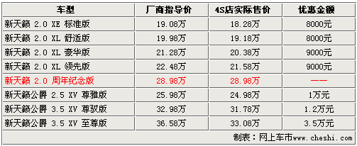 2009年6月16日,東風日產推出了新天籟周年紀念版車型,售價為28.98萬。這款新車是在天籟2.5L車型的基礎上,增加了BOSE5.1ch環(huán)繞音響系統(tǒng)和超大型雙層全景天窗等舒適性配置,大大提升了這款車的性價比。近日,記者在走訪北京地區(qū)的東風日產4S店時了解到:目前新天籟周年紀念版還沒有現(xiàn)車到店,目前預定的消費者將在7月底提到現(xiàn)車。
