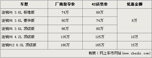 途銳是大眾首款引進我國的SUV車型,在3.6L及4.2L率先上市后,大眾為了滿足消費者的更大胃口,緊接著又推出了搭載12缸發(fā)動機的6.0L車型。隨著大排量消費稅的頒布,給9月份后入關的大排量車型帶來了一次不小的沖擊,令大排量汽車價格都上調了不少,大眾途銳6.0L頂級版也從原來158萬元的價格上調至了180元。近日據(jù)網(wǎng)上車市價格數(shù)據(jù)監(jiān)測顯示,大眾途銳全系的最高優(yōu)惠達到了15萬元,具體詳情請看下表: