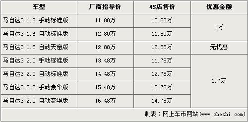 據(jù)長(zhǎng)安馬自達(dá)4s店銷售人員介紹,除了4月份上市的1.6L馬自達(dá)3自動(dòng)天窗版沒有優(yōu)惠外,其余車型均有優(yōu)惠,最高達(dá)到了1.5萬元。馬自達(dá)3的1.6L車型有1萬元的優(yōu)惠,經(jīng)優(yōu)惠后全系入門級(jí)的1.6L手動(dòng)標(biāo)準(zhǔn)版售價(jià)從11.80萬元降到了10.80萬元。馬自達(dá)3的2.0L車型有1.7萬元的優(yōu)惠,經(jīng)優(yōu)惠后全系最高配的2.0L自動(dòng)豪華版售價(jià)跌破了15萬元,僅售14.78萬元。