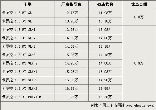 卡羅拉是一汽豐田于旗下的主力經濟型轎車,上市后憑借著時尚的外觀贏得了消費者的喜愛。卡羅拉全系共有5款車型,排量分為1.6L、1.8L,價格區(qū)間為13.28萬元-17.98萬元。前段時間,豐田官方對卡羅拉全系下調了廠商指導價,最高下降了9000元。近日根據網上車市價格監(jiān)測系統(tǒng)顯示,近期在經銷店購買卡羅拉車型的消費者,可以得到最高9000元的優(yōu)惠,具體詳情請看下表: