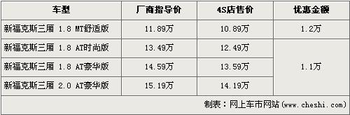 據(jù)長安福特經(jīng)銷商處銷售人員介紹,目前三廂新款福克斯全系現(xiàn)金優(yōu)惠最高1.2萬元。三廂新款福克斯分為1.8L和2.0L兩種排量,入門級(jí)車型的1.8L手動(dòng)舒適版售價(jià)下降到了10.89萬元,高配的2.0L自動(dòng)豪華版售價(jià)也降到了14.19萬元。