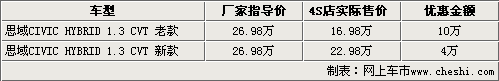 作為東風(fēng)本田以整車(chē)進(jìn)口形式引入國(guó)內(nèi)銷(xiāo)售的思域混動(dòng)力車(chē)型,自上市以來(lái)銷(xiāo)量的逐年遞增并獲得了良好的市場(chǎng)反響,而它的繼任者新款思域混動(dòng)力也于今年6月份正式上市銷(xiāo)售。近日根據(jù)網(wǎng)上車(chē)市價(jià)格檢測(cè)系統(tǒng)顯示,本田混合動(dòng)力思域出現(xiàn)了大幅優(yōu)惠,新款車(chē)型優(yōu)惠4萬(wàn)元,老款車(chē)型優(yōu)惠幅度更是達(dá)到了10萬(wàn)元。具體車(chē)型售價(jià)見(jiàn)下表: