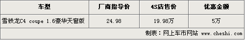 據(jù)4S店銷售人員介紹,目前銷售的C4轎跑車只有頂配1.6豪華天窗版,店內有銀色和紅色現(xiàn)車供應,數(shù)量有限。頂配版原來廠商指導價格為24.98萬元,現(xiàn)在售價僅為19.98萬,直降5萬元現(xiàn)金,車價不足20萬元。