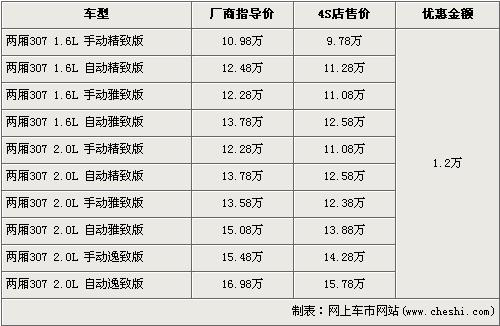 據(jù)東風(fēng)標(biāo)致經(jīng)銷店銷售人員介紹,兩廂標(biāo)致307分為1.6L和2.0L兩種排量,目前全系優(yōu)惠1.2萬元,入門車型的1.6L 手動(dòng)精致版原廠商指導(dǎo)價(jià)為10.98萬元,經(jīng)優(yōu)惠后僅售9.78萬元,排量稍大的2.0L排量的低配車型手動(dòng)精致版經(jīng)優(yōu)惠后售價(jià)為11.08萬元。