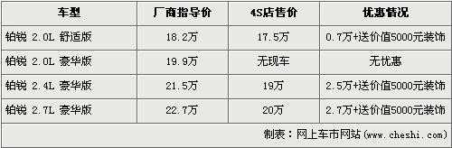 據(jù)北京克萊斯勒4s店銷售人員介紹,克萊斯勒鉑銳已經(jīng)停止進(jìn)口,除了2.0L 豪華版已沒有庫(kù)存車外,經(jīng)銷店內(nèi)還剩部分其他車型庫(kù)存車。經(jīng)7000元優(yōu)惠后,2.0L舒適版的售價(jià)從18.2萬(wàn)元下降到了17.5萬(wàn)元。2.4L豪華版經(jīng)2.5萬(wàn)元優(yōu)惠后,售價(jià)降到了19萬(wàn)元。全系最高配的2.7L豪華版經(jīng)2.7萬(wàn)元優(yōu)惠后,售價(jià)下降到了20萬(wàn)元。購(gòu)買鉑銳的消費(fèi)者在得到現(xiàn)金優(yōu)惠的同時(shí),還可以得到價(jià)值5000元的內(nèi)部裝飾。