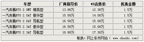 作為一汽奔騰的最新轎車車型,代號為B50的奔騰1.6L三廂新車正式上市已經(jīng)有段時間了。這款新車裝備了與速騰同款的1.6L發(fā)動機,與馬自達6睿翼采用同平臺生產(chǎn)。網(wǎng)上車市網(wǎng)站由經(jīng)銷商處得知,奔騰B50全系仍無優(yōu)惠,為預訂銷售狀態(tài),訂金1000元。而老款的B70全系車型則給出了1.5萬元的降幅。具體詳情如下:
