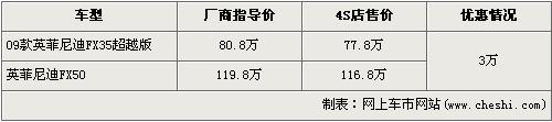 在今年,英菲尼迪FX系列上市了兩款車型,一個(gè)是以新成員身份加入的FX50,售價(jià)為119.5萬(wàn)元。另一個(gè)是FX35的改款車型-09款FX35,售價(jià)為80.8萬(wàn)元。隨著兩款新車的上市,老款的FX35和FX45都已停止了進(jìn)口。近日據(jù)網(wǎng)上車市價(jià)格監(jiān)測(cè)系統(tǒng)顯示,英菲尼迪全系出現(xiàn)了3萬(wàn)元的優(yōu)惠,具體詳情請(qǐng)看下表: