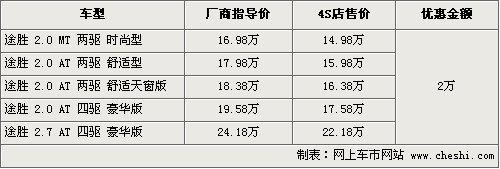 據(jù)4S店銷售人員介紹,目前購(gòu)買途勝全系可以優(yōu)惠現(xiàn)金2萬元,其中2.0兩驅(qū)時(shí)尚版優(yōu)惠后售價(jià)為14.98萬元。除了現(xiàn)金優(yōu)惠外,此前贈(zèng)送加油卡的活動(dòng)已經(jīng)不再舉行,F(xiàn)車方面,各經(jīng)銷商處現(xiàn)車數(shù)量不多,部分還需要預(yù)訂,定期最快為1周時(shí)間。