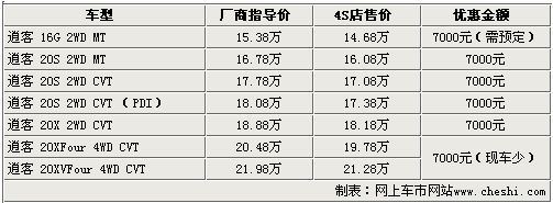 東風(fēng)日產(chǎn)推出的逍客車型是在國內(nèi)第一款真正意義上的跨界車,這款車既擁有SUV的時尚外觀和通過性,又有轎車的舒適性和省油優(yōu)勢。根據(jù)網(wǎng)上車市價格監(jiān)測系統(tǒng)顯示,目前在北京地區(qū)購買逍客的消費者,可以享受到全系7000元的現(xiàn)金優(yōu)惠,但是1.6L車型需預(yù)定。具體車型以及價格如下:
