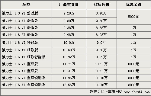 據(jù)4S店銷(xiāo)售人員介紹,目前雅力士全系車(chē)型有黑色、紫色等現(xiàn)車(chē)供應(yīng)。因?yàn)檐?chē)型較多,現(xiàn)車(chē)主要集中在1.3、1.6舒適版手動(dòng)和自動(dòng)擋車(chē)型上,其余高配車(chē)型均需要預(yù)訂,F(xiàn)金優(yōu)惠方面1.3排量?jī)煽钴?chē)可以?xún)?yōu)惠現(xiàn)金5000元,1.6精致版優(yōu)惠則達(dá)到了1萬(wàn)元,最低售價(jià)僅為8.38萬(wàn)元。至尊版車(chē)型優(yōu)惠8000元現(xiàn)金,如果消費(fèi)者到店的話還將有一部分的優(yōu)惠。