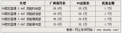 歐藍德是三菱汽車第一款采用轎車底盤形式生產(chǎn)的SUV,沿用了三菱Lancer(藍瑟)轎車的平臺,具有轎車乘坐的舒適性,同時它又有SUV的特性。根據(jù)網(wǎng)上車市價格檢測系統(tǒng)顯示,目前歐藍德車型主要為09款車型,最高讓利達1.7萬元。具體車型以及價格如下: