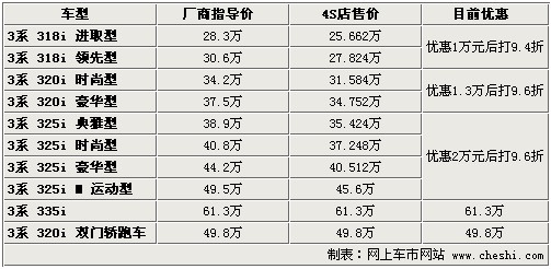 據(jù)4S店銷售人員介紹:目前寶馬3系全系車型都有一定幅度優(yōu)惠,最高降幅達(dá)到3.9萬(wàn)元。雖然較之前的優(yōu)惠幅度有所減小,但是目前現(xiàn)車比較多,尤其寶馬318i系列與325i系列店內(nèi)現(xiàn)車充足,320i豪華型需預(yù)定,預(yù)訂需等1個(gè)月至2個(gè)月時(shí)間。據(jù)經(jīng)銷商介紹,寶馬318i進(jìn)取型將近停產(chǎn),所以喜歡這款車的朋友盡快到店內(nèi)訂車,目前店內(nèi)有少量現(xiàn)車顏色不全。在優(yōu)惠幅度上,寶馬318i系列在優(yōu)惠1萬(wàn)元后可打9.4折,寶馬320系列兩款車型在優(yōu)惠1.3萬(wàn)元后可打9.6折,325系列可優(yōu)惠2萬(wàn)后再打9.6折。寶馬335i和320i雙門轎跑車無(wú)任何優(yōu)惠,預(yù)定車需等4-6個(gè)月。