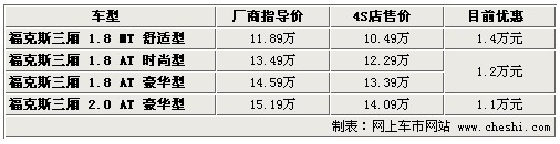 據(jù)4S店銷(xiāo)售人員介紹:目前?怂谷龓1.8升三款車(chē)型現(xiàn)車(chē)充足,尤其銀色、灰色、藍(lán)色、黑色車(chē)型現(xiàn)車(chē)較多,手動(dòng)擋車(chē)型目前優(yōu)惠1.4萬(wàn)元,優(yōu)惠后僅售10.49萬(wàn)元,1.8升自動(dòng)版車(chē)型優(yōu)惠1.2萬(wàn)元。2.0升車(chē)型目前現(xiàn)車(chē)較少,顏色也不齊全,訂車(chē)需等待3周左右,目前優(yōu)惠1.1萬(wàn)元。