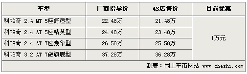 據(jù)雪佛蘭4S店銷(xiāo)售人員介紹:目前2.4升排量車(chē)型現(xiàn)車(chē)較為充足,顏色較齊全,白色、銀色現(xiàn)車(chē)很多,但無(wú)紅色車(chē)型,如預(yù)定需要等待1-2周時(shí)間。3.2車(chē)型依舊無(wú)現(xiàn)車(chē),訂車(chē)需等一個(gè)月時(shí)間?婆疗嫒的壳翱蓛(yōu)惠1萬(wàn)元現(xiàn)金,不送任何裝飾。