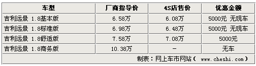作為一款上市時(shí)間較長(zhǎng)的車(chē)型,吉利遠(yuǎn)景系列近期也開(kāi)始加大優(yōu)惠幅度促銷(xiāo)。網(wǎng)上車(chē)市網(wǎng)站近日由經(jīng)銷(xiāo)商處了解到,現(xiàn)在購(gòu)買(mǎi)遠(yuǎn)景車(chē)型,將享受到最高5000元的現(xiàn)金優(yōu)惠,不過(guò)各家4S店內(nèi)的車(chē)型并不齊全,部分車(chē)型仍處于無(wú)車(chē)的狀態(tài)。具體詳情如下: