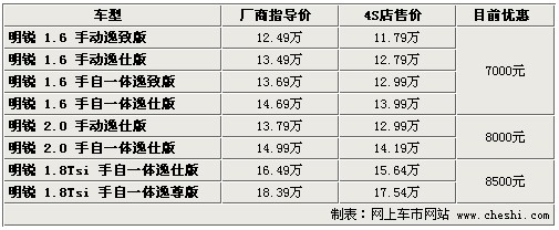 據(jù)4S店銷售人員介紹:目前明銳全系最高優(yōu)惠8500元,部分車型無現(xiàn)車,預(yù)定需等待1個半月至3個月時間。1.6升車型優(yōu)惠已達7000元,較之前優(yōu)惠幅度增加了1000元。2.0升車型優(yōu)惠仍為8000元,但個別經(jīng)銷商處有銀色、灰色現(xiàn)車,不過優(yōu)惠幅度最高僅6000元。1.8TSI的兩款車型優(yōu)惠8500元,較之前有所縮水,但目前經(jīng)銷商處有現(xiàn)車,顏色也較齊全。雖然1.6升車型優(yōu)惠幅度較之前有所增加,但目前依然沒有現(xiàn)車,需要預(yù)訂。如在店內(nèi)做裝飾還可打8折,雖然折后裝飾價格仍有些偏高,但產(chǎn)品質(zhì)量可以保證。
