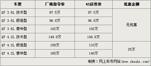 Q7是奧迪打造的第一款“高性能SUV”,同時(shí)也是奧迪引進(jìn)中國(guó)的第一款頂級(jí)SUV車型。Q7憑借杰出的運(yùn)動(dòng)性、高超的操控性及沖擊性極強(qiáng)的外形在上市時(shí)就獲得了人們的關(guān)注。隨著在上海車展亮相的改款新Q7即將上市,在售的老款Q7已經(jīng)停產(chǎn)。近日根據(jù)網(wǎng)上車市價(jià)格檢測(cè)系統(tǒng)顯示:在售的奧迪Q7出現(xiàn)了最高為25萬(wàn)元的優(yōu)惠,具體詳情請(qǐng)看下表: