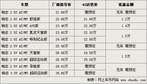據(jù)4S店銷售人員介紹,目前豐田銳志全系最高可以優(yōu)惠到1.5萬元,其中2.5S舒適版優(yōu)惠為1.2萬元,AVX版優(yōu)惠1.4萬元,同時部分可以還可贈送便攜式導航。目前現(xiàn)車主要有紅色、銀色等可供消費者選擇。導航版以及超級運動版車型仍需要預訂,訂金為5000元,需要等一個月左右時間。
