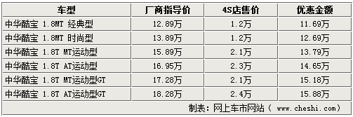 酷寶系列車型,不僅外形時尚,動力也相當充沛,不僅可與進口跑車如蓮花競速相媲美,也帶動了自主跑車市場的競爭。近期網上車市網站了解到,隨著市場競爭的加劇,現(xiàn)在北京的中華4S店內最高可給出24000元的現(xiàn)金優(yōu)惠,令此車型再次引起關注。具體詳情如下: