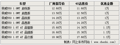 1.8L榮威550上市已經(jīng)有段時(shí)間了,隨著廠家產(chǎn)能的逐步提升,各家4S店的貨源問題早已得到解決。據(jù)網(wǎng)上車市網(wǎng)站了解,目前北京地區(qū)的榮威4S店里的1.8T現(xiàn)車比較充裕,而1.8L車型的優(yōu)惠力度也逐步加大,近期分別有1萬到1.3萬元的優(yōu)惠。具體詳情如下: