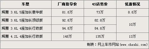 據(jù)北京進(jìn)口大眾經(jīng)銷店銷售人員介紹,目前輝騰3.6L 5座加長(zhǎng)豪華版有8.8萬元的現(xiàn)金優(yōu)惠,經(jīng)優(yōu)惠后3.6L 5座加長(zhǎng)豪華版的售價(jià)降到了73萬元,跌破了75萬元。排量稍大的4.2L 4座加長(zhǎng)行政版有13萬元的優(yōu)惠,經(jīng)優(yōu)惠后售價(jià)從148萬元下降到了135萬元。銷售人員還介紹,4.2L輝騰沒有現(xiàn)車,欲購(gòu)買的消費(fèi)者需交訂金10萬元預(yù)訂。