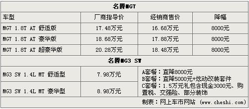 據(jù)MG名爵經(jīng)銷商處銷售人員介紹,目前MG7和MG3 SW都有充足的現(xiàn)車,只有部分車型需要預(yù)訂,MG7最高可優(yōu)惠8千元,而MG3 SW則有三重好禮可選其一,當(dāng)然最直接的就是直降8千元,而1.5萬(wàn)元的大禮包的優(yōu)惠也挺大的,如果你喜歡個(gè)性車就選擇炫動(dòng)改裝還可在優(yōu)惠五千元。