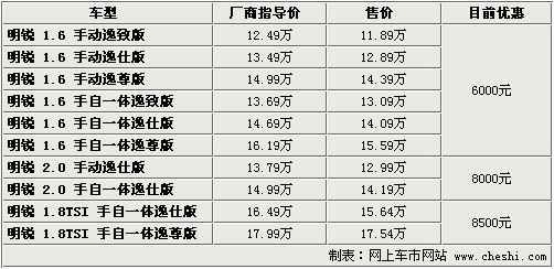 據(jù)4S店銷售人員介紹:目前明銳全系最高優(yōu)惠8500元,部分車型有現(xiàn)車,顏色包括銀色、灰色車型。如需預(yù)定需等待1個(gè)月至3個(gè)月時(shí)間。目前1.6升車型優(yōu)惠達(dá)6000元,2.0升車型優(yōu)惠仍為8000元,1.8TSI的兩款車型優(yōu)惠8500元,較之前有所縮水。如在店內(nèi)做裝飾還可打8折,雖然折后裝飾價(jià)格仍有些偏高,但產(chǎn)品質(zhì)量可以保證。