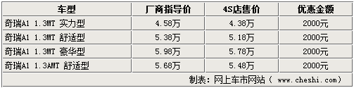 09款奇瑞A1系列在老款車型的基礎(chǔ)上增加了實(shí)力型和AMT兩種新車型,同時(shí)舒適型和豪華型官方降價(jià)4000元,售價(jià)已進(jìn)入五萬元以內(nèi)。網(wǎng)上車市網(wǎng)站近日了解到,各家4S店內(nèi)的新車價(jià)格有所變化,全系車型均可小幅優(yōu)惠2000元。詳情如下: