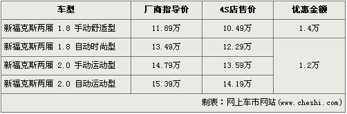 據(jù)北京福特4S店銷售人員介紹:目前購(gòu)買兩廂?怂沟南M(fèi)者最高可以得到1.4萬(wàn)元的優(yōu)惠。1.8L手動(dòng)舒適版經(jīng)1.4萬(wàn)元優(yōu)惠后,售價(jià)降到了10.49萬(wàn)元。1.8L自動(dòng)時(shí)尚版以及2.0L的運(yùn)動(dòng)版車型有1.2萬(wàn)元的優(yōu)惠,優(yōu)惠后售價(jià)分別降到了12.29萬(wàn)元、13.59萬(wàn)元和14.19萬(wàn)元。