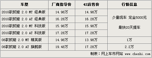 據(jù)東風(fēng)雪鐵龍銷售人員介紹,2010款凱旋目前沒(méi)有任何優(yōu)惠,車型顏色也不太齊全,預(yù)訂訂金為5000元,最快20天可提車。另外08款凱旋還有少量現(xiàn)車低價(jià)甩貨,最高優(yōu)惠幅度為2.2萬(wàn)元左右,顏色以黑色、銀色為主。北京地區(qū)各4S店由于訂單不同,各店銷售的現(xiàn)車顏色有所不同。